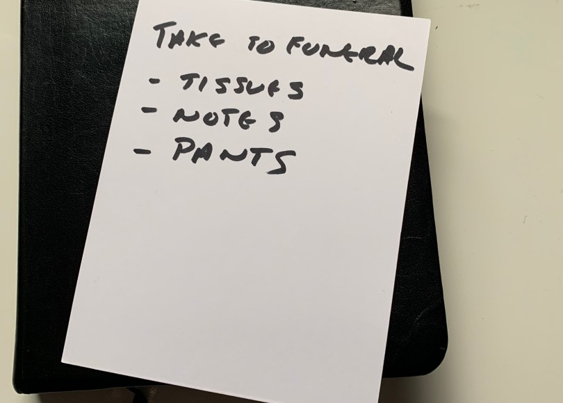 When it comes to leading funerals, we each have our list of things we will always check. We each have our safety net of people who care about us and for us. We each have our moments of personal misadventure. (I thought about the word “shame” or “embarrassment” or “chagrin”. But it’s not like Dan walked out on the platform without any pants.)